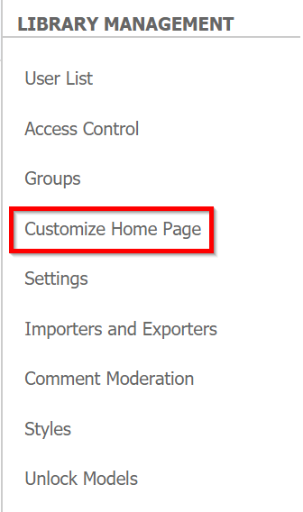 On the customisation page you will see a list of links on the right that shows all what can be changed in this library. By clicking on the 'Customise Home Page' link, this will take you to the home page customisation options.