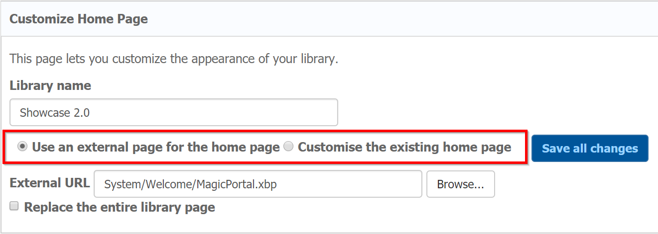 You have two options, the first being that you can use an external page to act as the homepage to this library, which just needs a URL of the external page, or the existing home page can be customised. When choosing the second option, the page will be extended with all the features that can be changed to the existing home page.