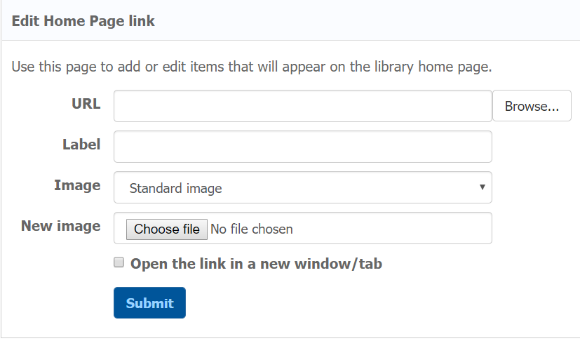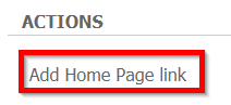 While in 'Customize home page', an option will be visible under 'Actions'. This allows a new home page link or items to be added to the library home page.