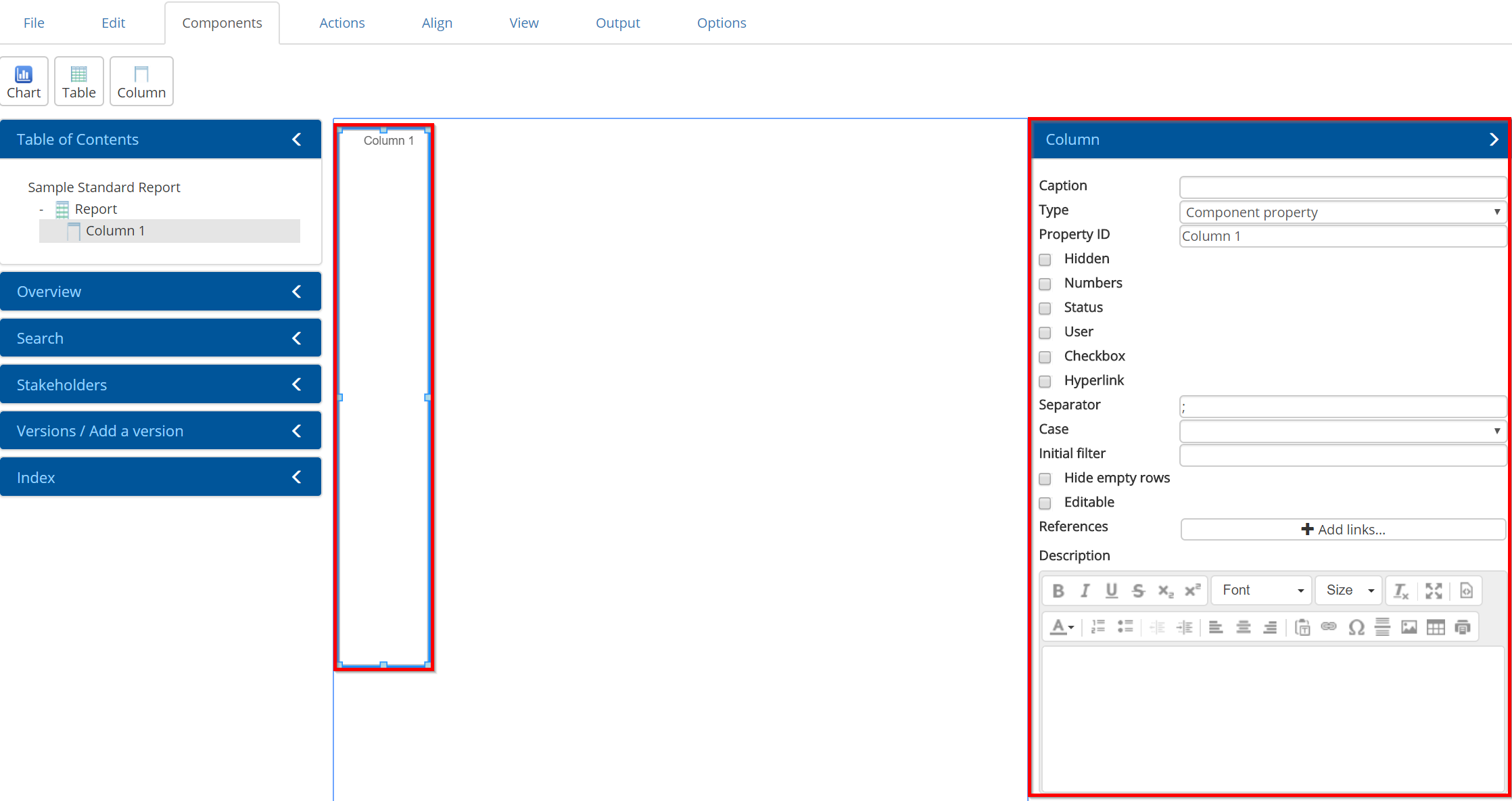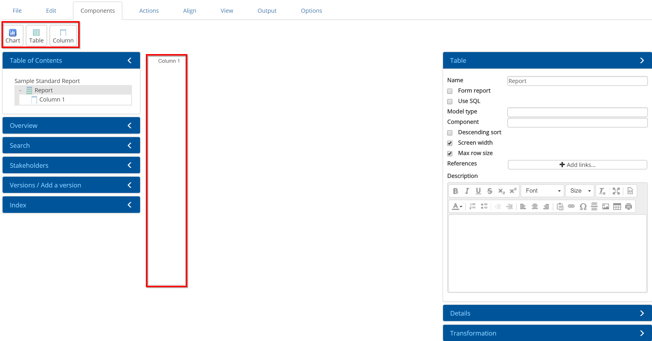 When a new report has been opened, only three components are available for building a report, Charts, Tables and Columns. The report starts off with a column already added.