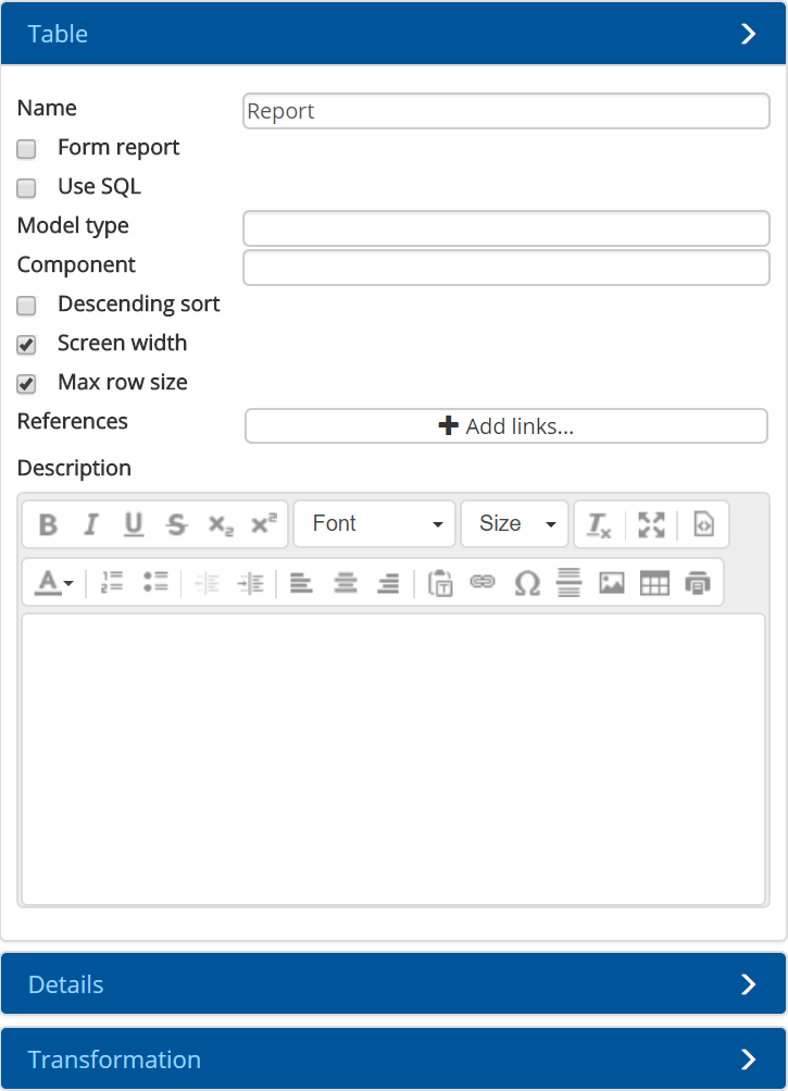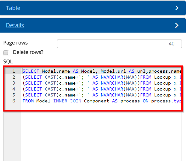 SQL can be used to populate the report with the desired information. Under Details, SQL code can be added here.