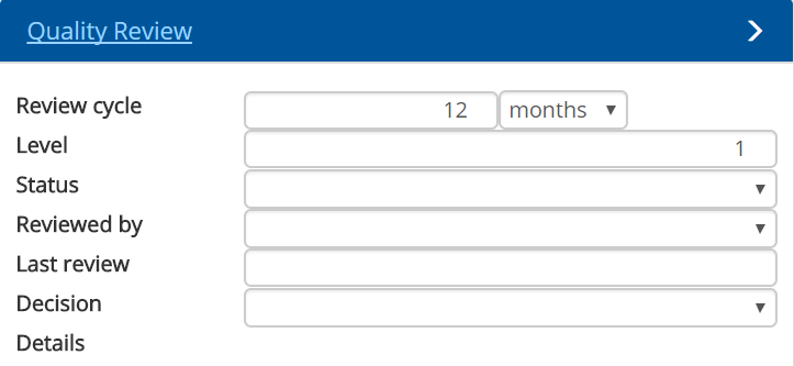 The Quality Review section highlights all the review details. The author can specify how frequently the model should be reviewed, the review level the model is at, the current review status, who last reviewed the model with the date, the review decision and any additional details.