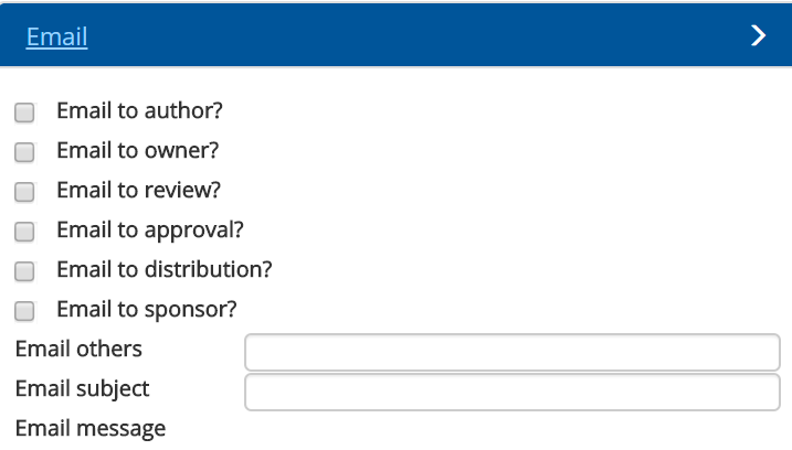 For both Workflow Steps and Library Folders, the author has a choice of where a notification email will get sent to. Additional people can also be emailed by adding in their email addresses. Also, an email subject and message can be incorporated.