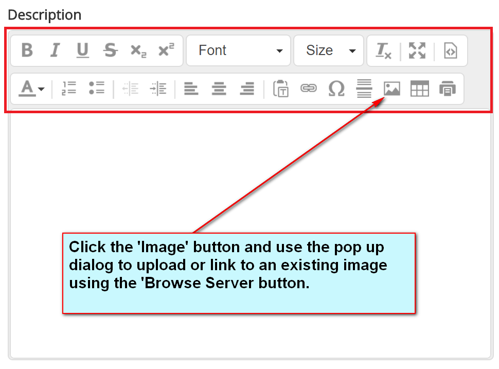 Author allows images to be added in various ways to our html editor fields (editor fields are the text entry areas that allow formatting i.e Work instruction or description fields) typically they have a toolbar, as seen below.