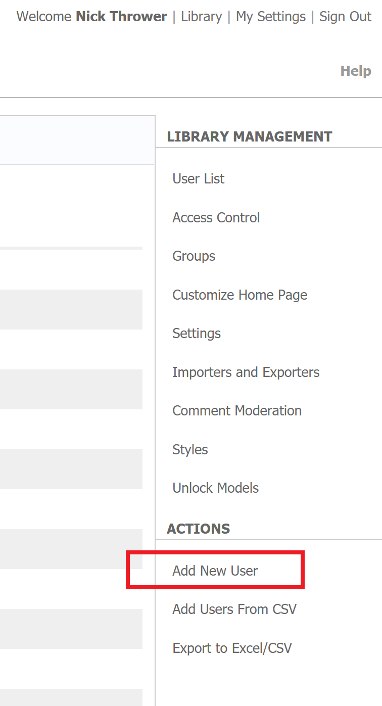 To add a user to a library a user will need admin access. After logging in to a library, click the user initials in the upper right corner of the screen and locate the 'Manage Library' link.