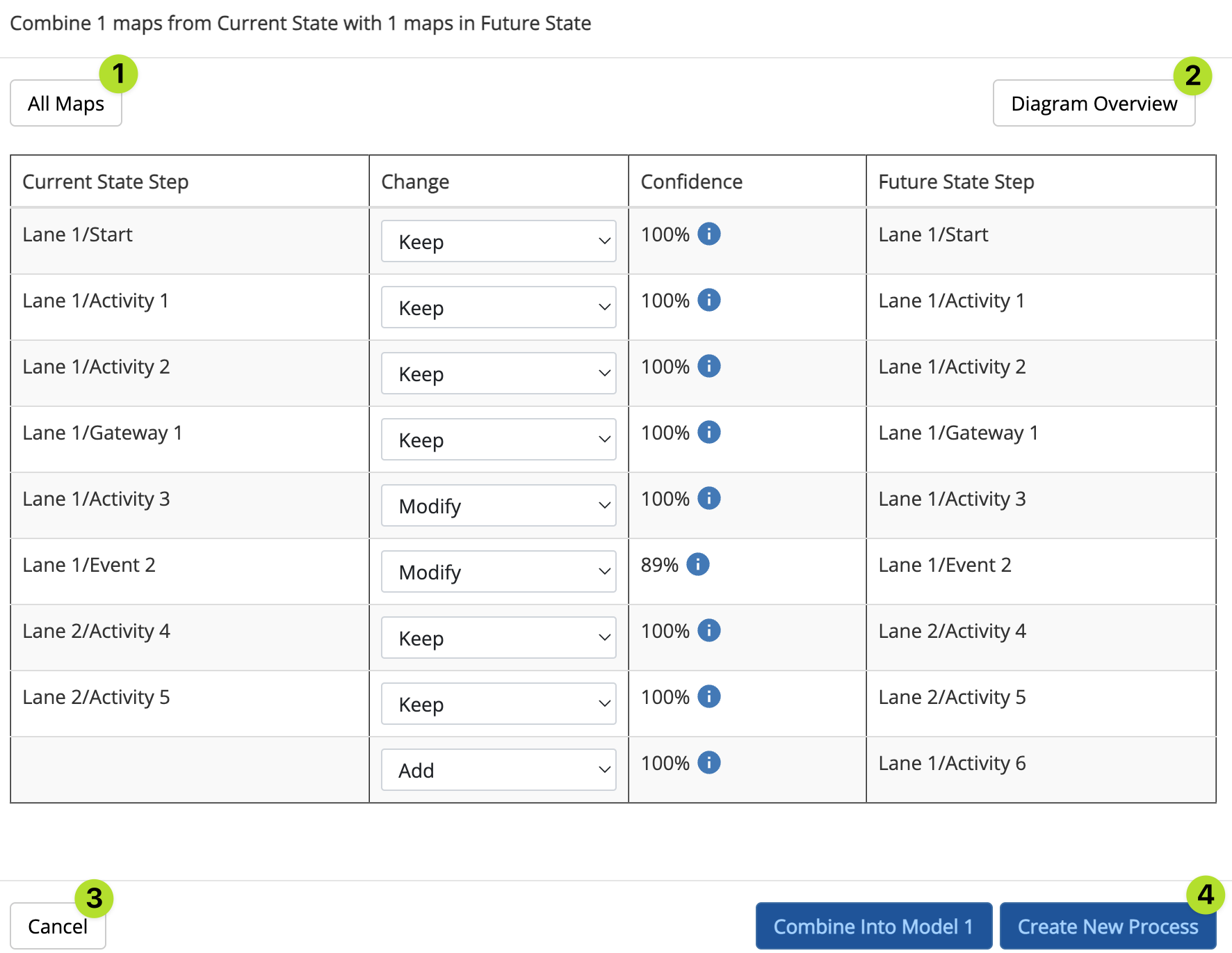 4. Once you are happy with the association then you can either Combine the future process maps into the original current state process maps or you can create a new combined process model.