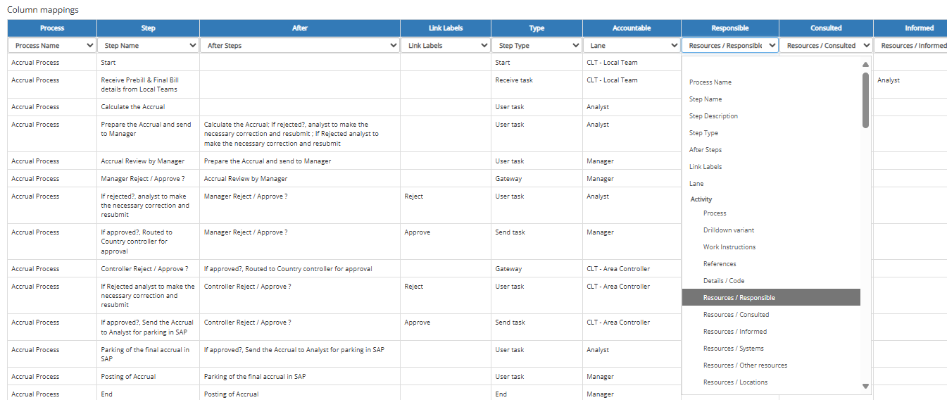 7. Ensure the column mappings from the Excel file are set to the correct process attributes on the importer.