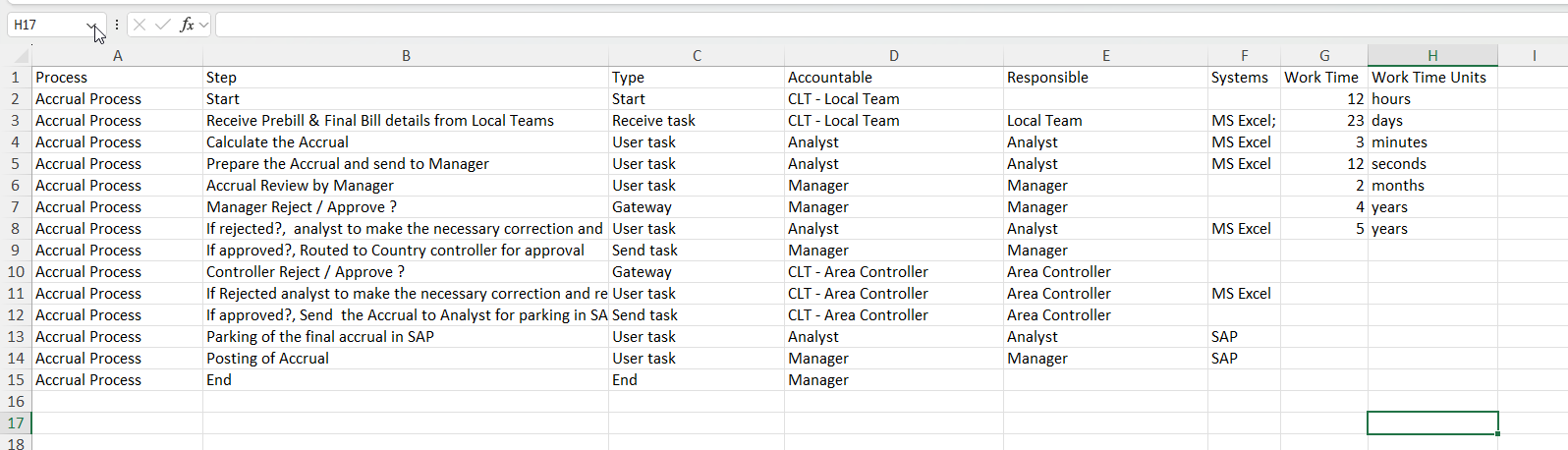 In order to save you the effort of manually transcribing the process definition into BusinessOptix, you can use the Import functionality to convert comma-separated value (CSV) files into a process model.