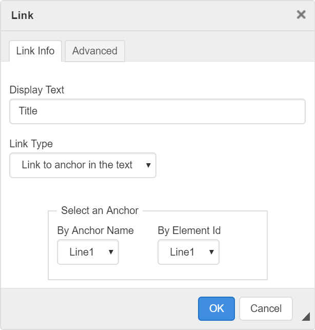 You will then see a section underneath telling you to select your anchor that was created. Once you've selected the anchor for both the 'Anchor name' and 'Element Id' fields, click 'OK'.